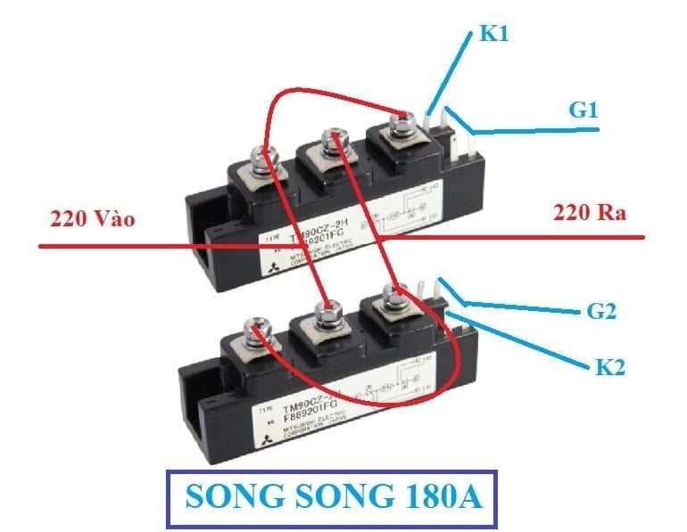 - Hinh số 3 vẫn là 90A (đưa nó về sơ đồ 1 con binh thường) nhưng có lợi thế là 1 chân chưa dùng đến, coi như là vẫn còn 1 module scr khác dự phòng khi hư có thể đảo ngược chiều lại ta lại được một module scr mới.