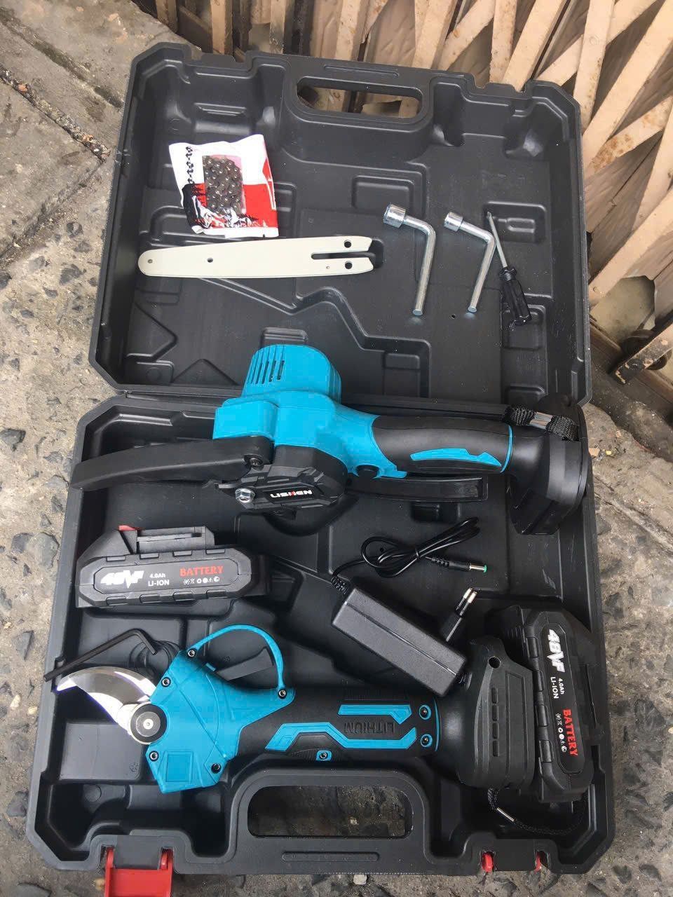 bộ sản phẩm không bao gồm pin sạc, chỉ có thân máy cưa 8inch và thân máy cắt cành pin. có hộp đi kèm.